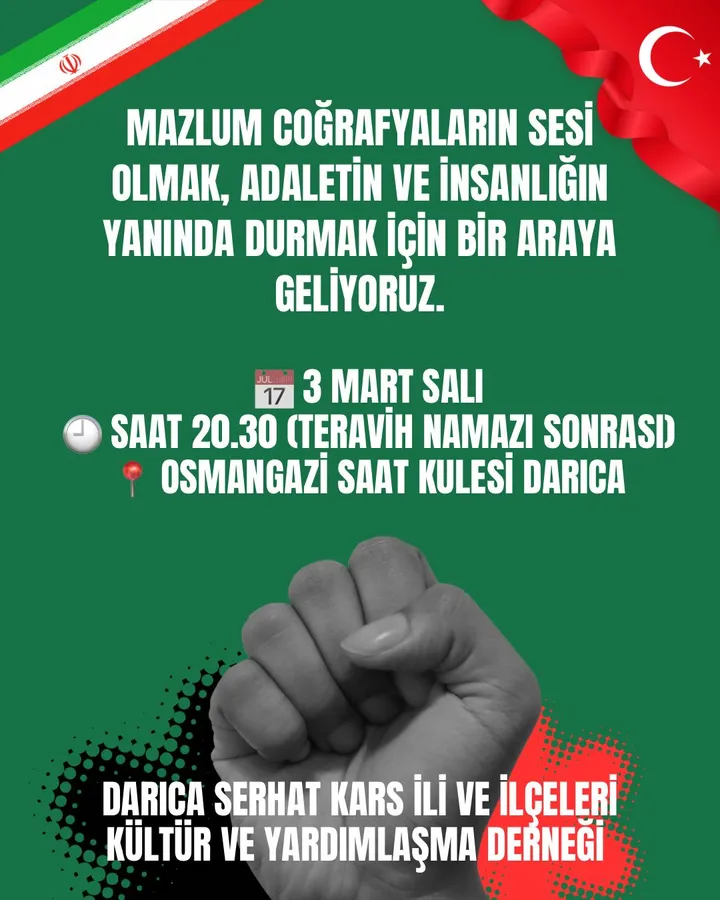 Darıca Serhat Karslılar Derneği Başkanı Aziz Tepebaş, İran’da yaşanan son gelişmeler ve İran’ın dini lideri olarak bilinen Ali Hamaney ile ilgili gündeme gelen olaylar üzerine bir yürüyüş davetinde bulundu.