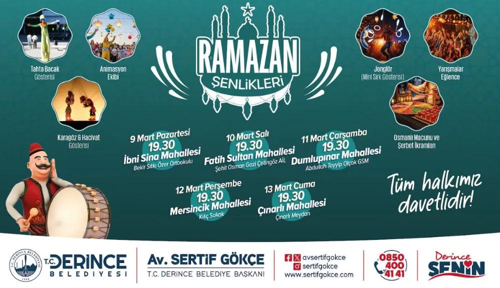Ramazan ayı kapsamında çocuklar ve aileleri için Derince’de birbirinden güzel etkinlikler organize ediliyor. Ramazan Şenlikleri adı altında gerçekleşecek olan programlar beş ayrı günde beş farklı mahallede yapılacak. Animasyon ekibi, tahta bacak gösterisi, Karagöz & Hacivat Gösterisi, Jonglör (Mini Sirk Gösterisi), yarışmalar ve eğlencelerin yer alacağı programlarda ayrıca katılımcılara Osmanlı macunu ve şerbet ikramı gerçekleşecek.