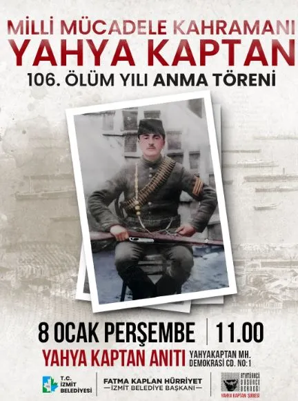 İzmit Belediyesi, Milli Mücadele döneminin önemli kahramanlarından Yahya Kaptan’ı vefatının 106. yıl dönümünde Yahya Kaptan Anıt Meydanı’nda düzenlenecek törenle anacak