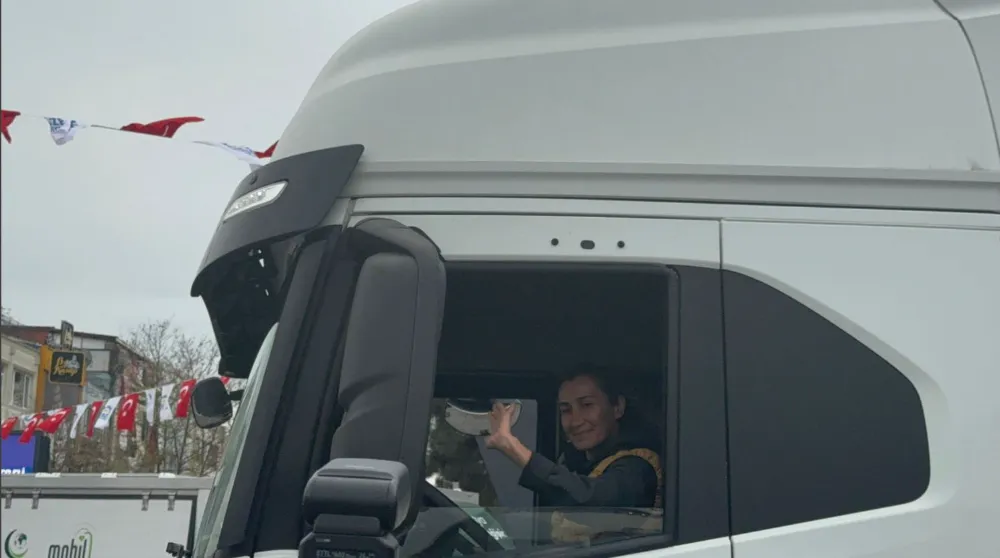 Konvoydaki tırlardan birinin direksiyonundaki kadın sürücü, vatandaşlardan alkış aldı.